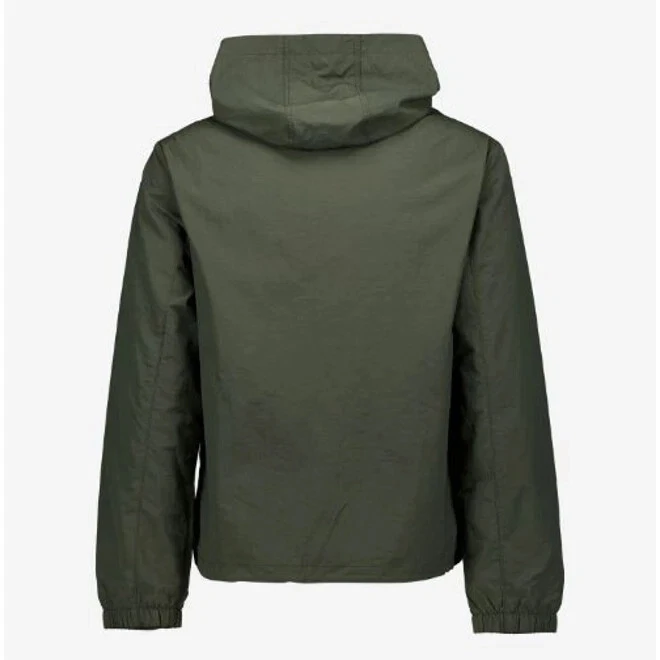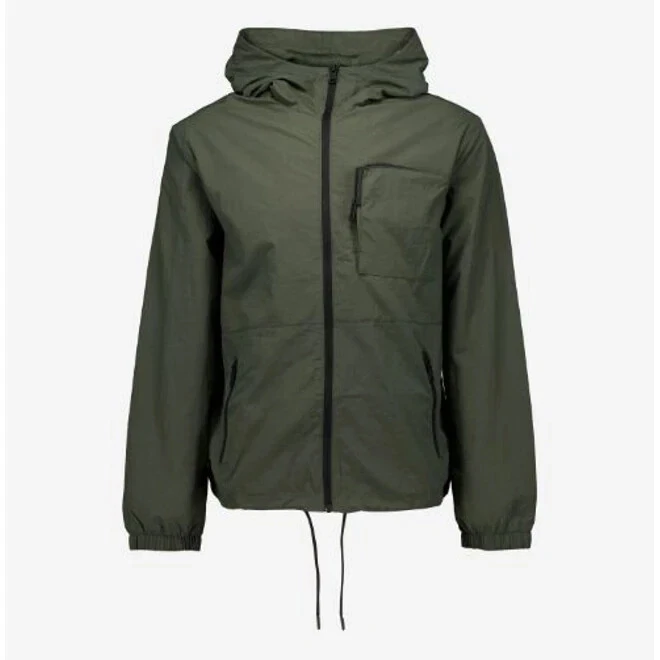 Rare Find Men's French Connection Khaki Green short tech trench jacket long sleeve hood attached zip fasten three pockets cuffed sleeves drawstring waist mesh lining Shell 100% polyamide lining 100% polyester machine wash size XL.